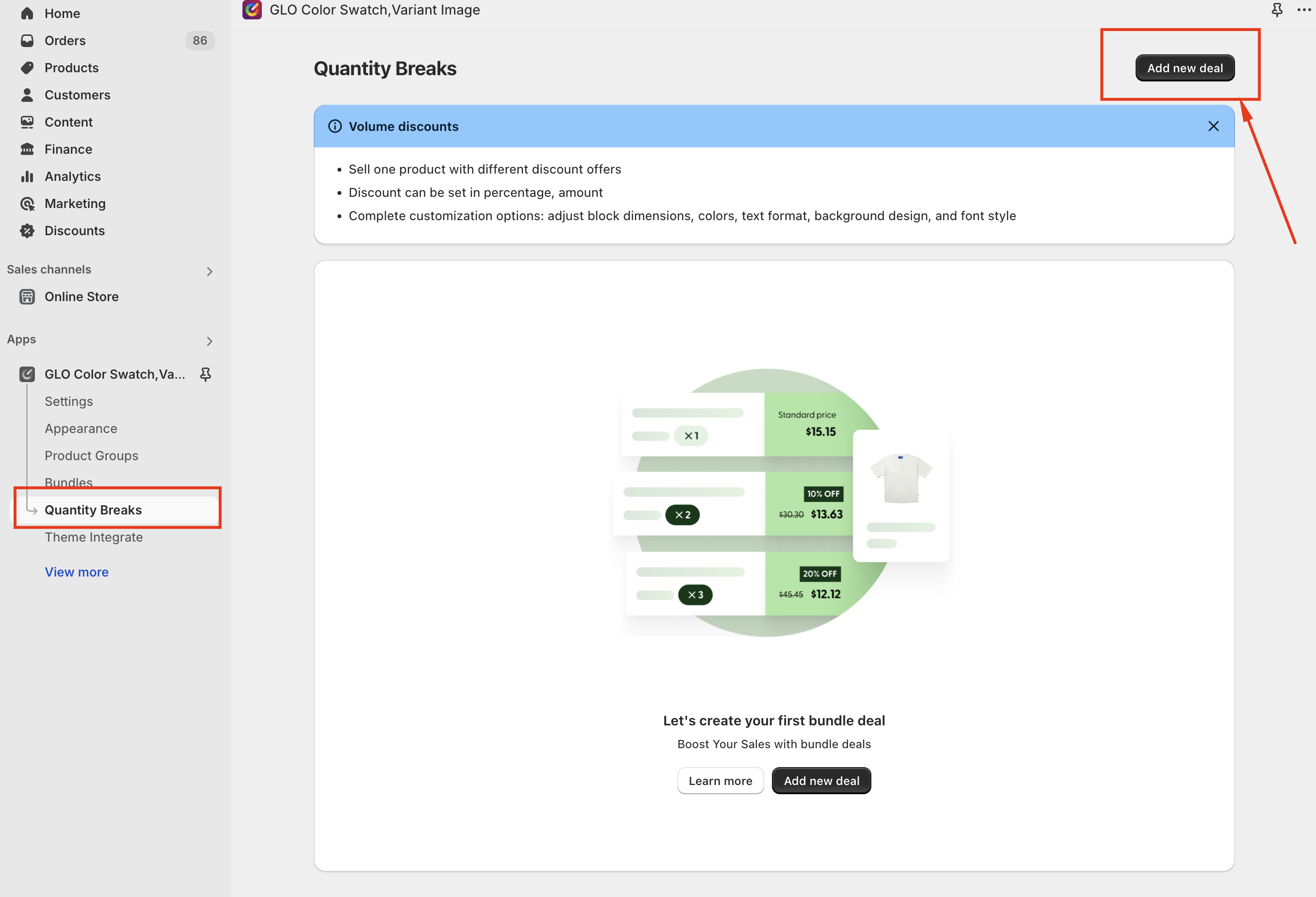 * Click **Apps** ->  choose **Bundles Quantity Breaks** option to showcase the offers.