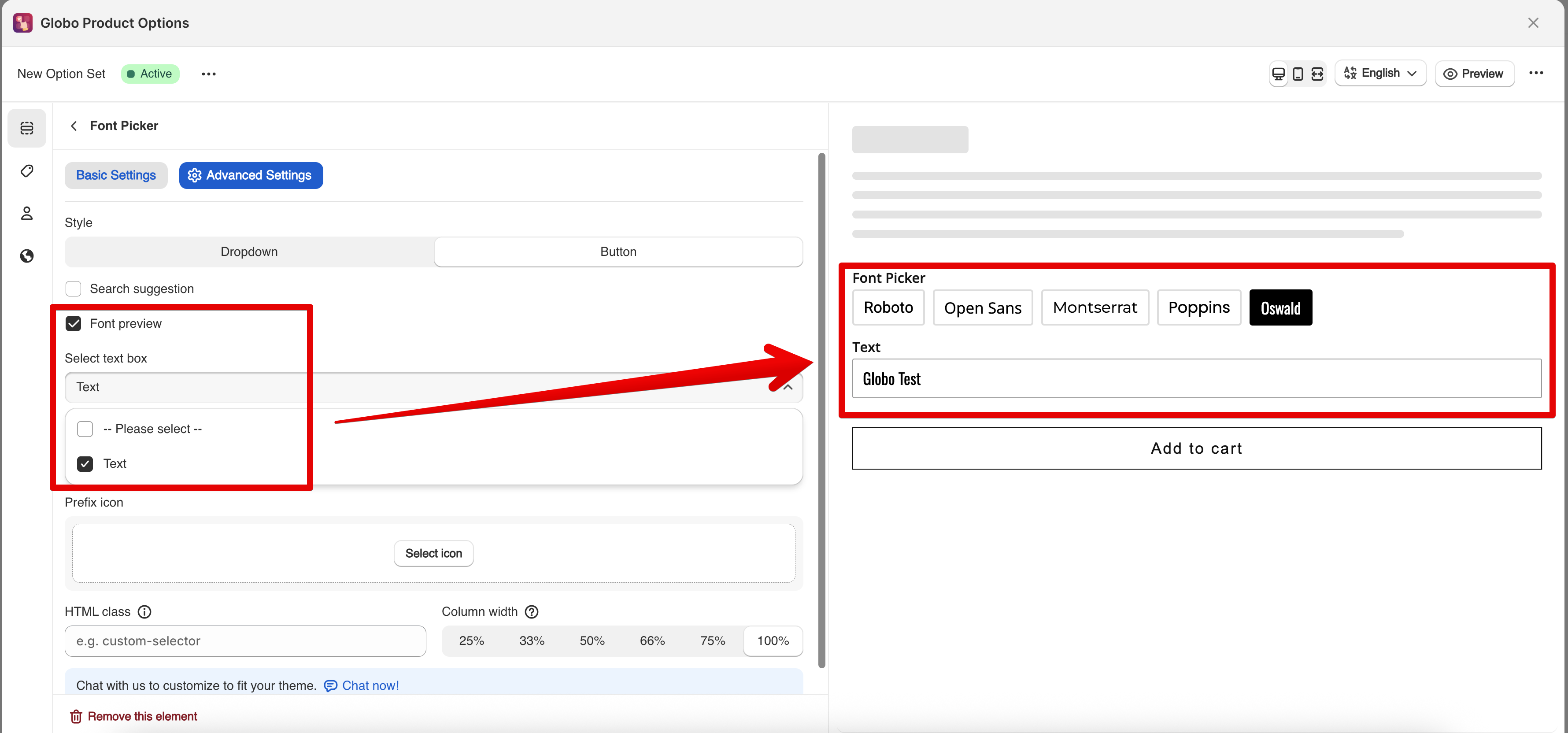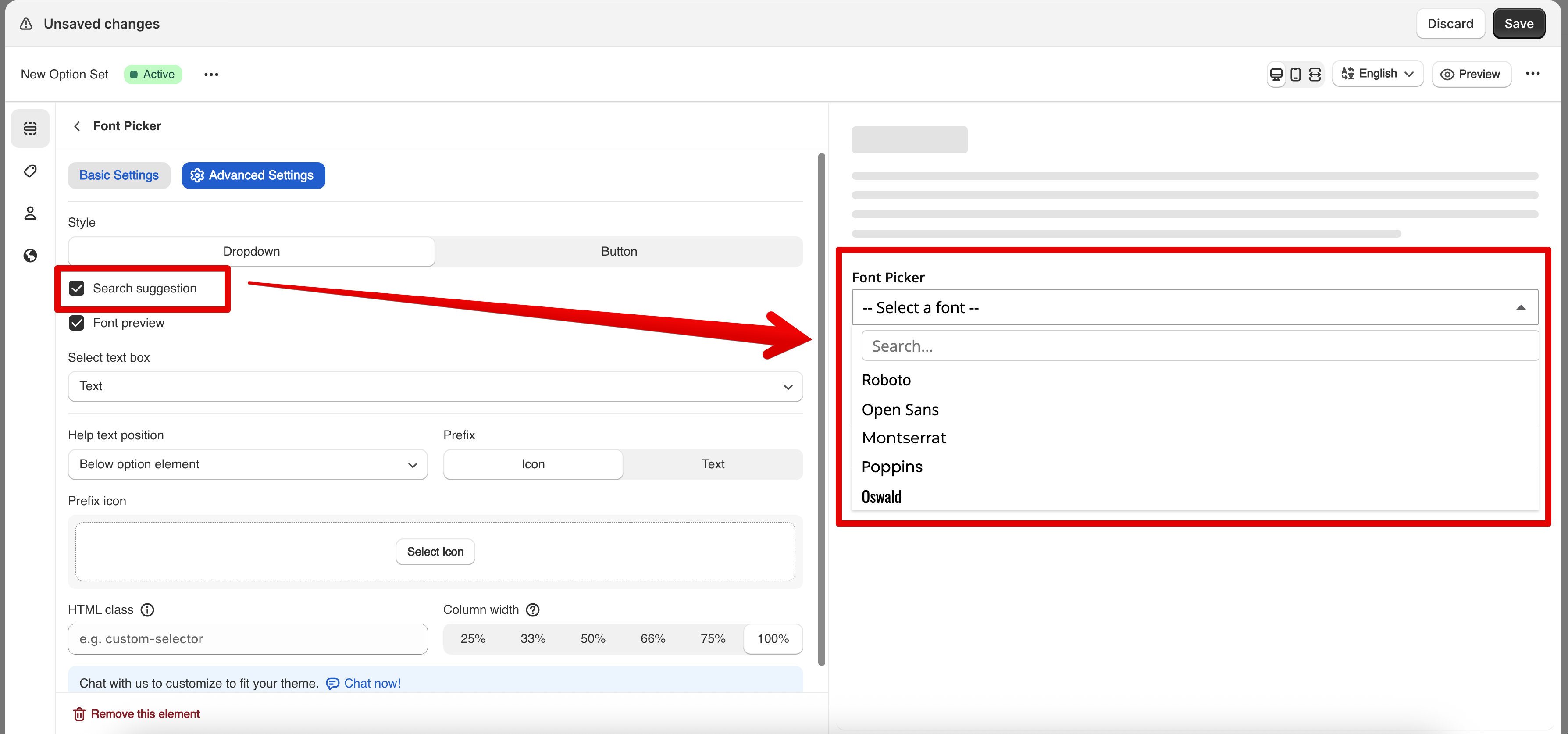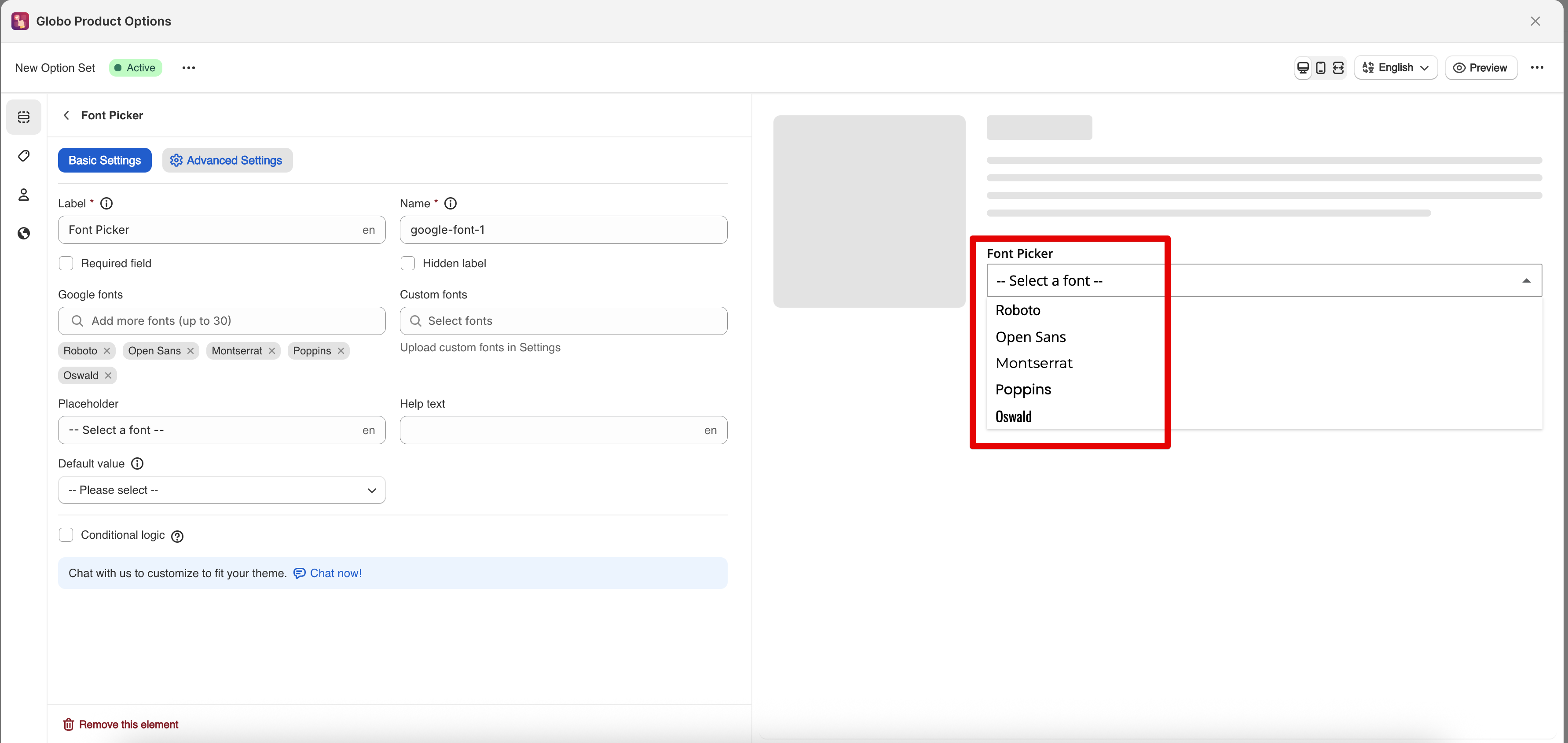 The Font Picker element allows customers to choose a font style from a predefined list. Itβs perfect for personalized products like custom signs, apparel, or engraved gifts β giving customers the freedom to style their text just the way they like.