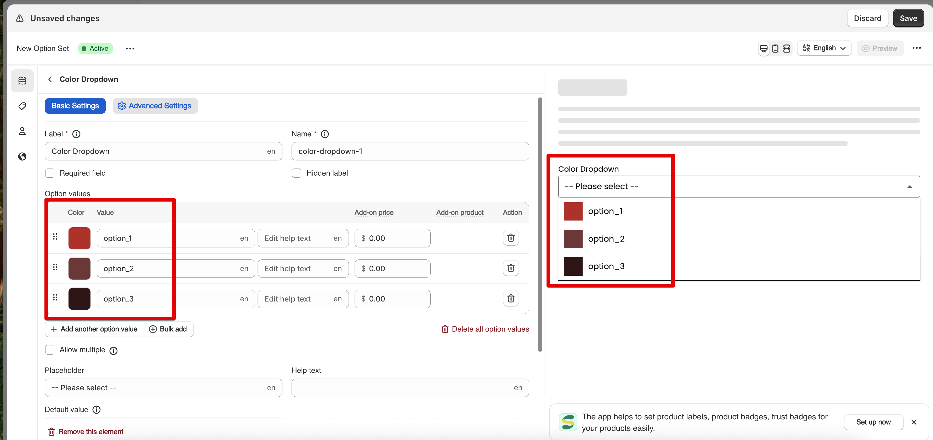 Both of these dropdown types help you to enhance the visual appeal of your product selection process, providing customers with an intuitive and interactive way to choose options.