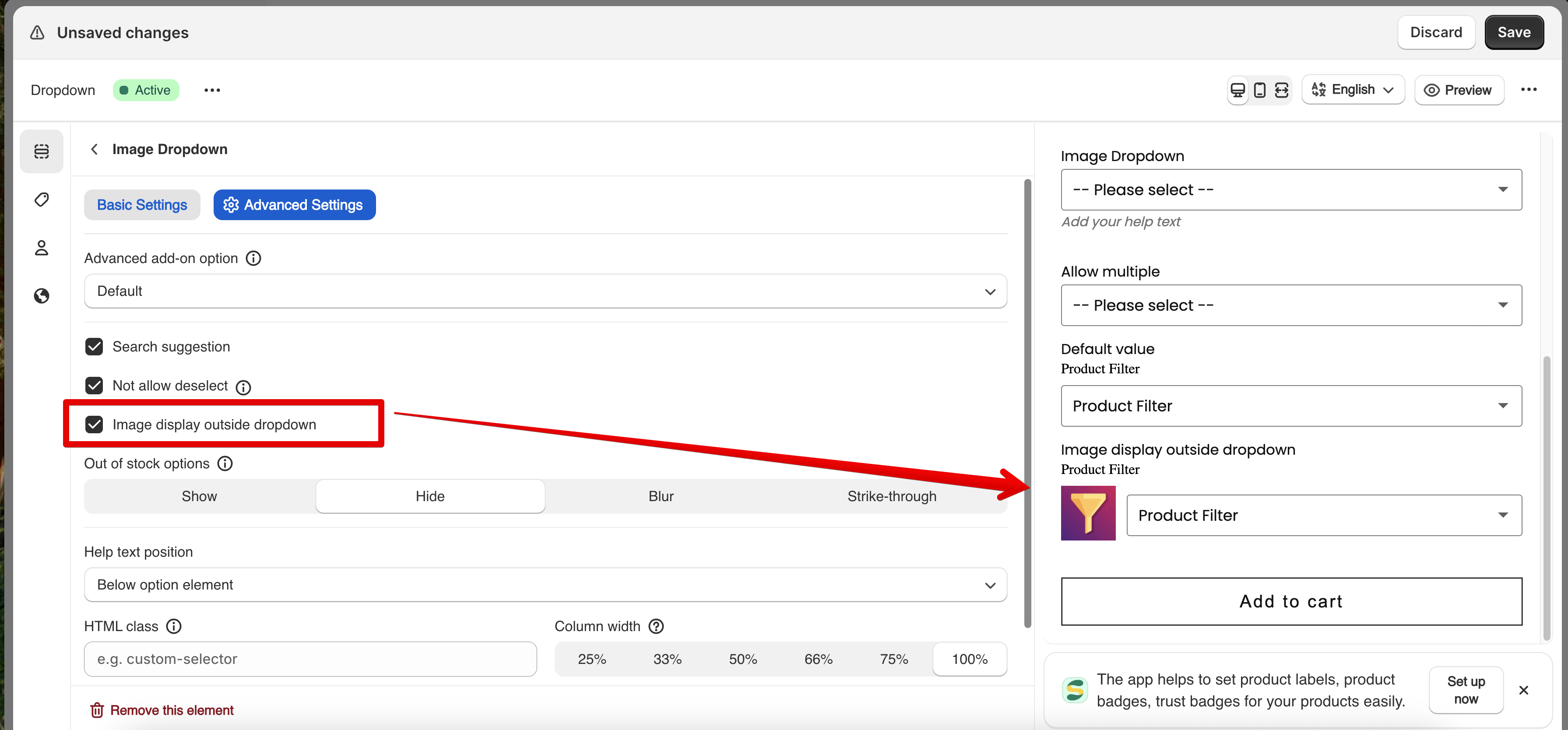 9. **Out of stock options:** In the **Image** and **Color Dropdown** elements, you can control how out-of-stock options are displayed to the customer. This feature helps improve the user experience by visually indicating which options are unavailable.