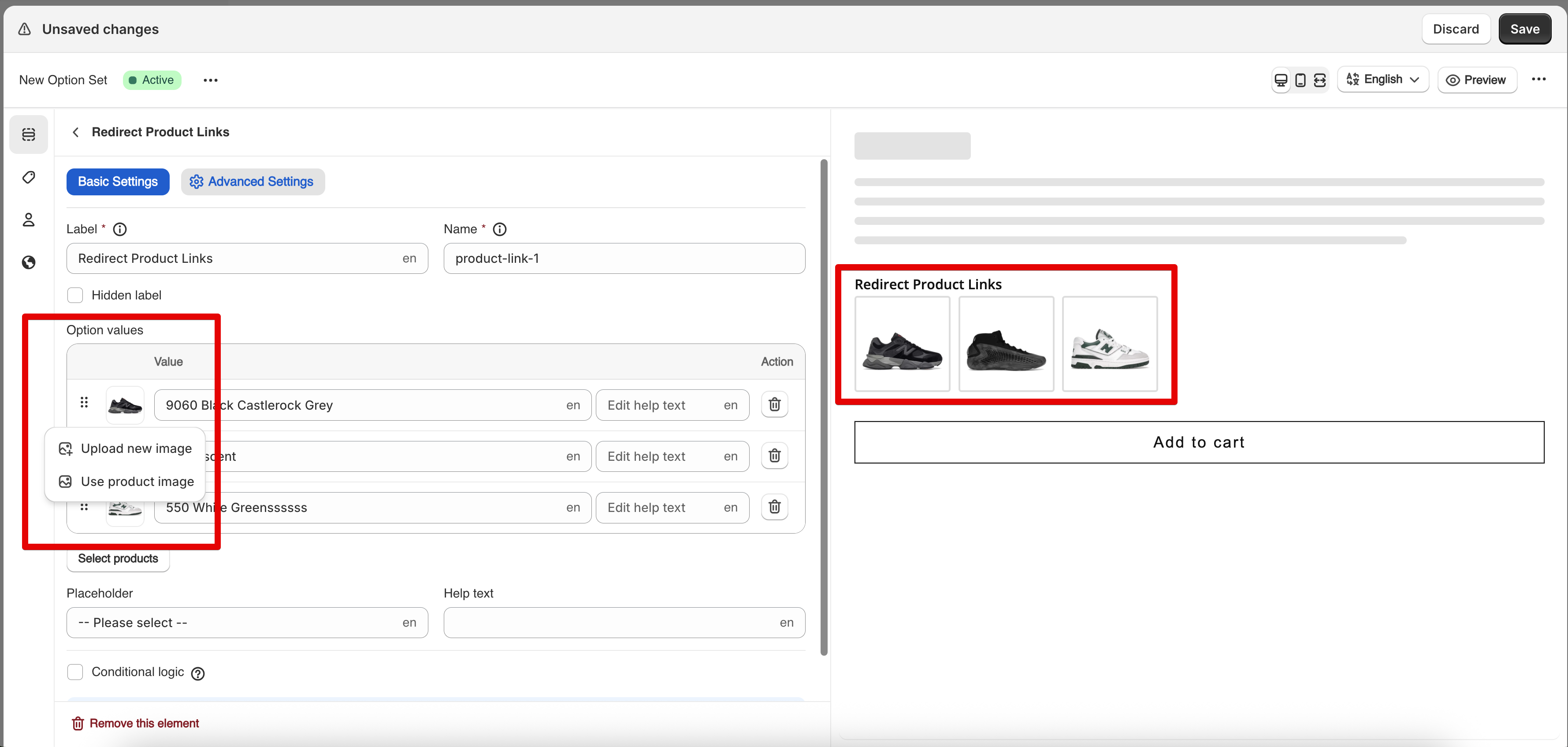 The **Redirect Link element** allows you to redirect customers to a **product page** when they click on an option. This is useful when you want to guide users to other related or recommended products directly from the product page.