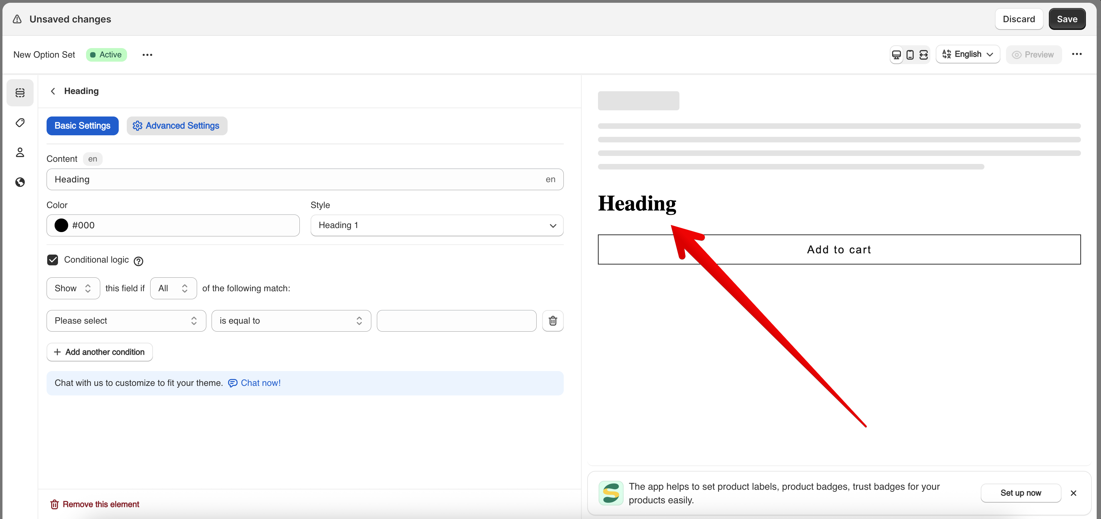 The **Heading element** is a static text field used to display a title or section header on your product page. It helps organize your form by separating groups of options or adding clear instructional text.