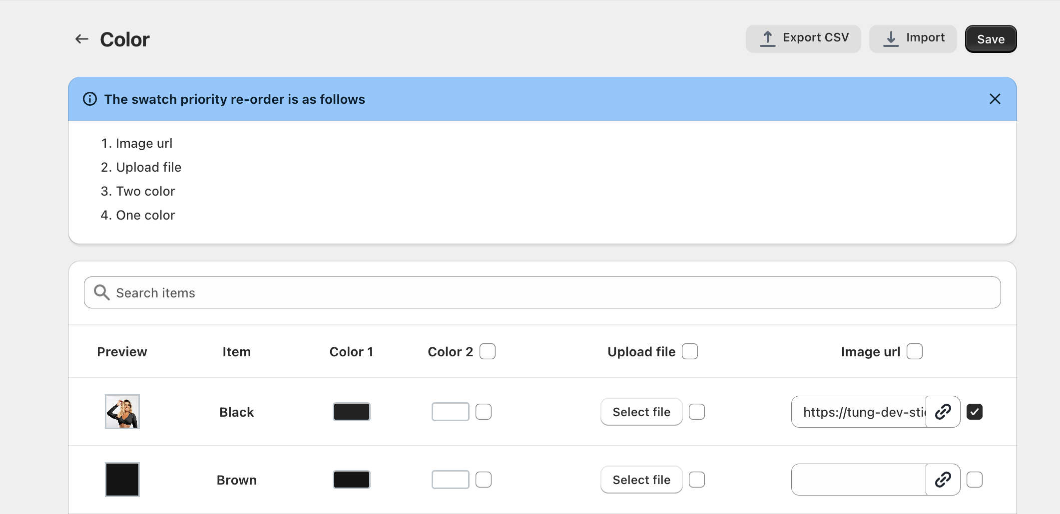 * Go to admin app GLOBO Color Swatch **Dashboard -> Options list**
