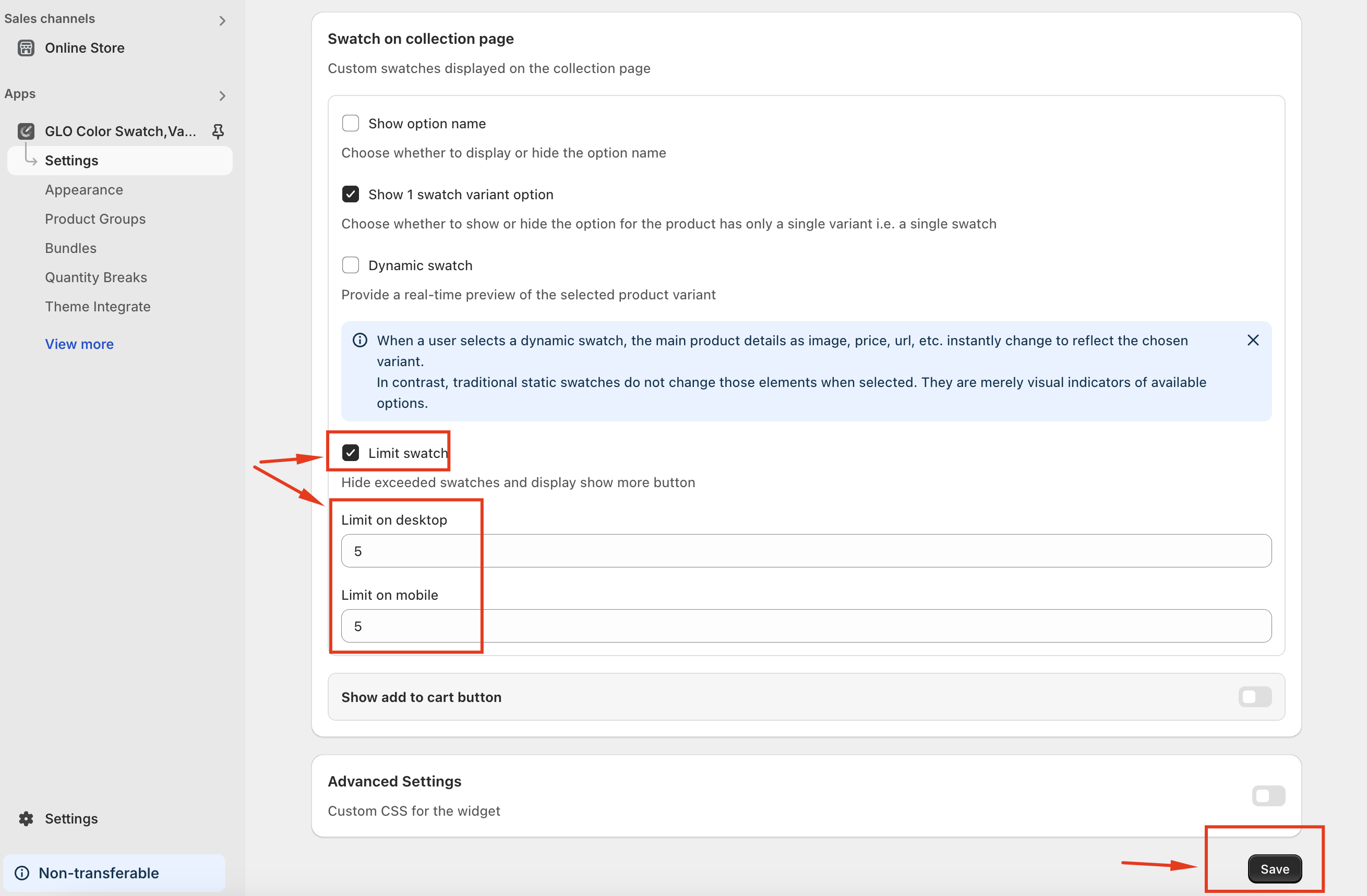 If you have a product has too many variant options, if you show all of them on the collection, the overall layout will not be clearn. We provide a solution to limit the maximum number
