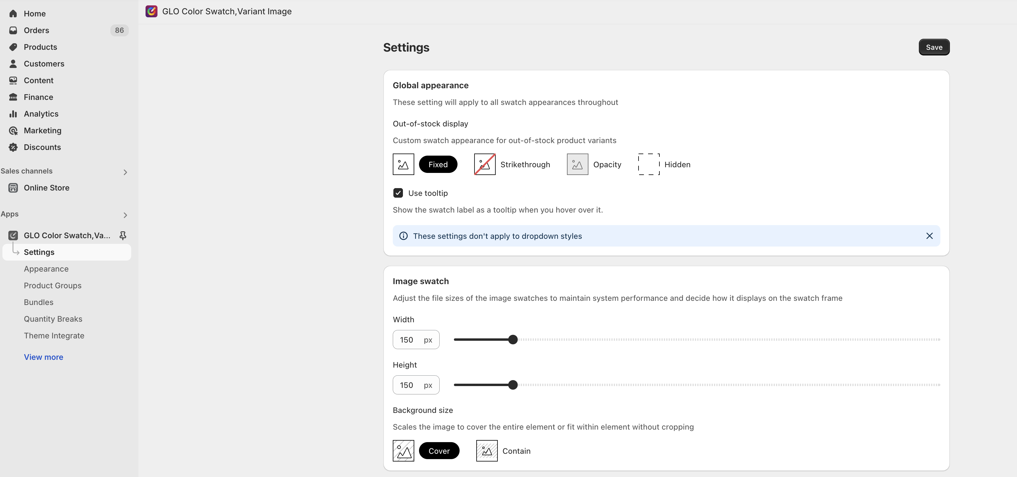 In admin **GLOBO Color Swatch**, navigate to **setting page -> Image swatch**