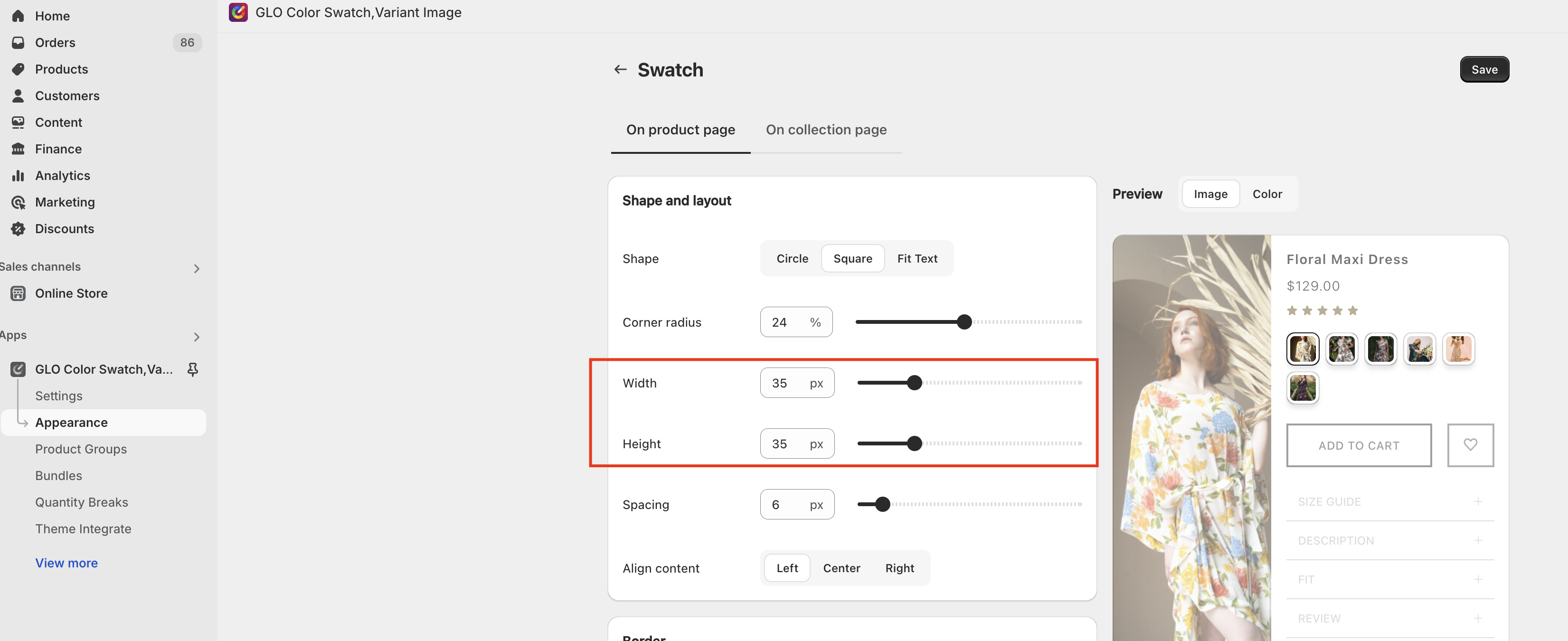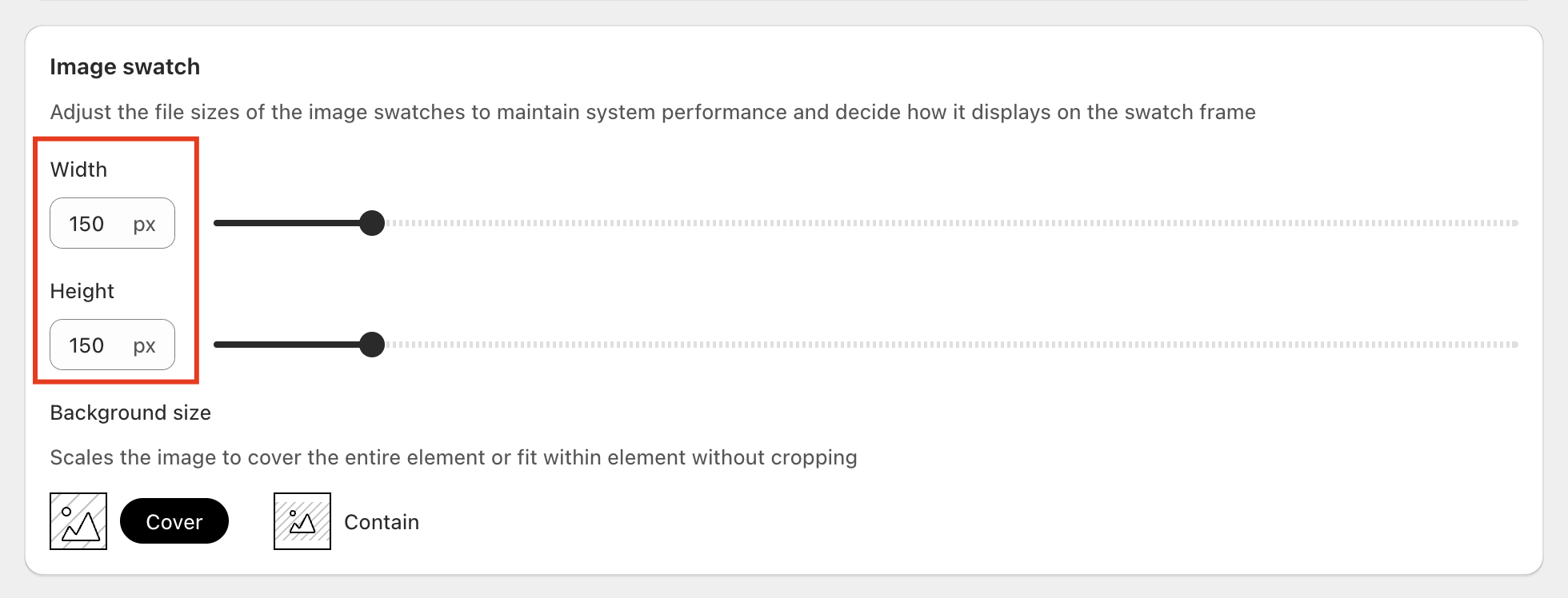 * You can set the image swatch size to 35px by 35px. If the image appears unclear, try increasing the size to around 50-60px.